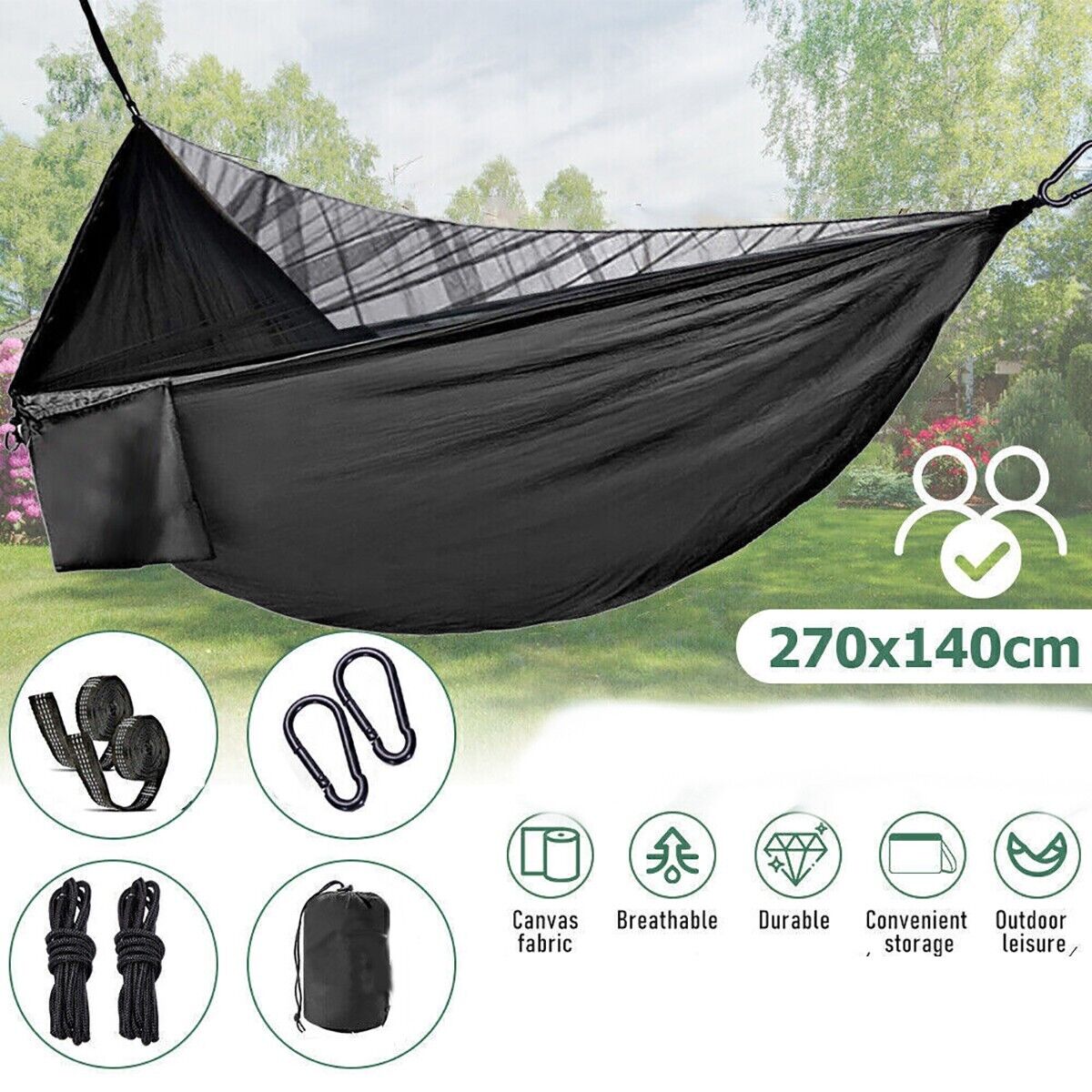 Amaca da campeggio in resistente nylon 210T con zanzariera integrata, ideale per trekking, escursioni e viaggi. Leggera, compatta e facile da montare in pochi minuti grazie a moschettoni e cinghie incluse. Può sostenere fino a 3 kg, misura 270x140 cm e si ripone in una pratica sacca cucita all'amaca. La zanzariera ultra fine protegge dagli insetti più piccoli, per un riposo sicuro e tranquillo all'aperto. Perfetta anche in giardino o come regalo per amanti della natura. MAGGIORI INFORMAZIONI Caratteristiche principali: Colore: Nero Materiale: Nylon 210T Dimensioni: 270 x 140 cm Portata massima: 3 kg Zanzariera integrata Cucitura ultra resistente La confezione contiene: Nr.1 Amaca con zanzariera integrata Nr.2 Cinghie Nr.2 Moschettoni in ferro Nr.2 Corde