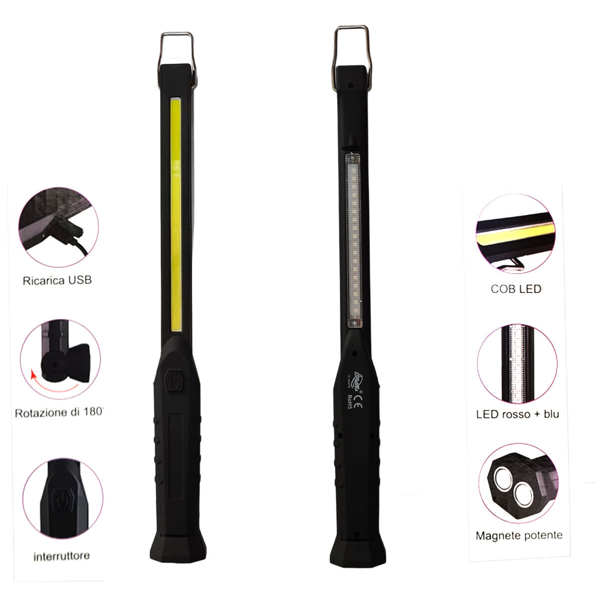TORCIA LED PORTATILE LAVORO RICARICABILE MAGNETE GANCIO EMERGENZA ROSSO BLU COB