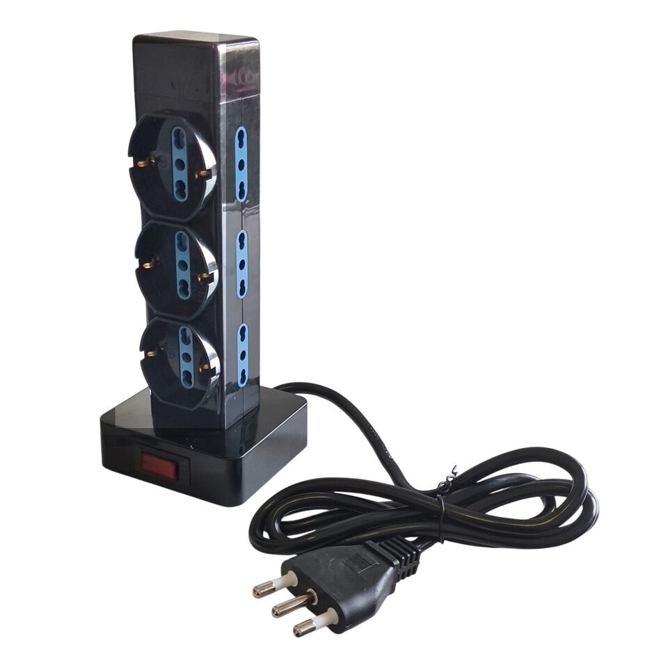 Multipresa a torre verticale da scrivania con 6 uscite bipasso 10/16A e 3 schuko protezione da sovratensione. La protezione da sovratensione protegge le apparecchiature elettroniche da sovratensioni e picchi improvvisi. La ciabatta ha una potenza massima di 2500W. MAGGIORI INFORMAZIONI Caratteristiche principali: Interruttore On Off Con 9 uscite (6 P17/11 10/16A bipasso e 3 schuko P40) Lunghezza cavo: 1,5mt Potenza nominale: 2500W Tensione nominale: 250V Protezione da sovraccarico Base maggiore della presa generale presa verticale, più stabile e sicuro da usare Facile da trasportare La confezione contiene: Nr.1 Multipresa Verticale