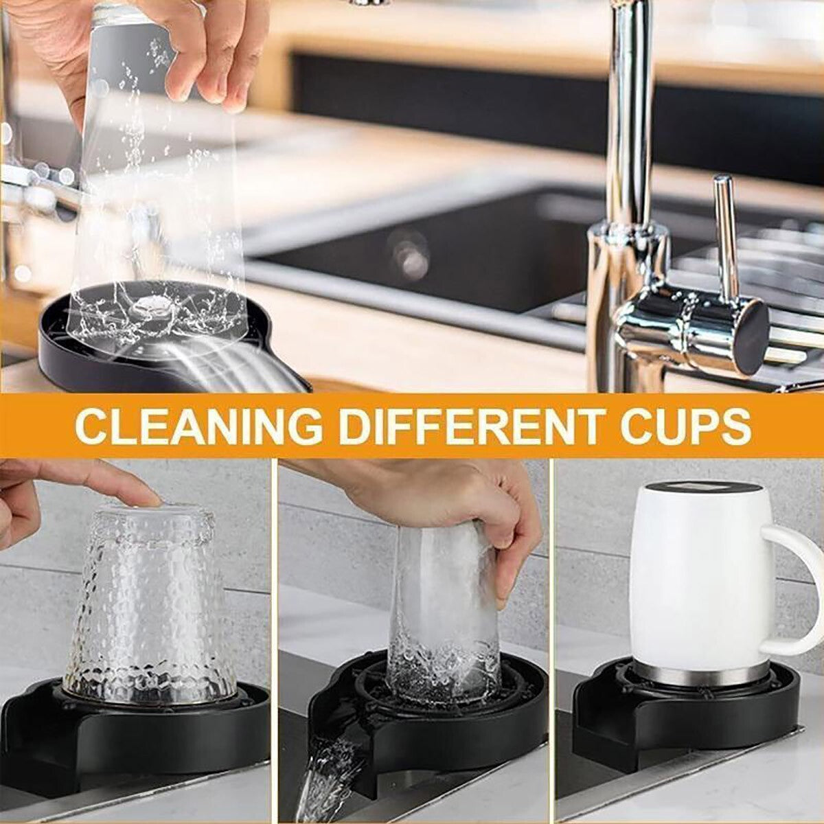 La riunione è finita, tutti sono andati a casa. È stata una bella festa, tutti si sono divertiti tantissimo! Ora spazza velocemente, porta fuori la spazzatura e... Oh no! Quanti bicchieri da lavare! Bicchieri, tazze da caffè e un sacco di altre tazze. Tutto questo è in attesa di essere lavato. Sembra che non finirai fino a molto tardi. Che noia! Anche solo pensare a una situazione del genere può farti sentire stanco. LAVAGGIO AD ALTA PRESSIONE Il meccanismo di questo utile strumento da cucina ti consente di pulire e risciacquare l'interno di bicchieri e tazze in modo rapido e semplice. La bocchetta incorporata consente il lavaggio multi-angolo coprendo tutti gli spazi all'interno dei tuoi bicchieri. Il lavaggio ad alta pressione è un modo efficace per rimuovere tutte le impurità dall'interno dei tuoi bicchieri senza dover mettere le mani al loro interno. È una soluzione perfetta quando il bicchiere è troppo piccolo per metterci mano o quando semplicemente non hai voglia di lavare i bicchieri a mano. OPERA CON UNA SOLA MANO Quando pulisci la cucina e lavi i piatti, avere tante braccia come un polpo sarebbe comodo, giusto? Sarebbero gradite mani in più. Qualsiasi strumento o accessorio che ti aiuti a completare le attività in modo più effic