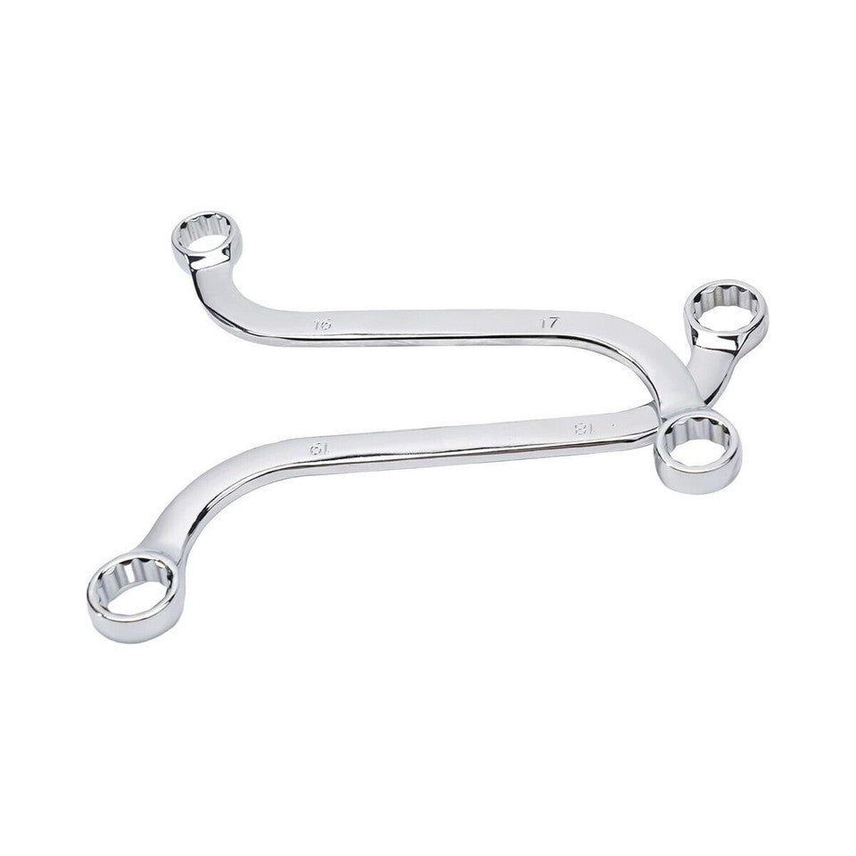 Set 5 Chiavi Combinate Poligonali Tipo S fisse ad anello poligonali 10-19mm Raggiungere i punti più accessibili della vostra auto o moto d'epoca, storica o moderna sarà comodo e semplice, grazie al gambo piegato a "S", che consente di raggiungere i dadi o bulloni passando attorno ad eventuali ostacoli presenti nel motore. Le teste a 12 punti consentono di innestare i dadi o i bulloni più facilmente, senza dover cercare il punto di aggancio come con le comuni chiavi esagonali aperte. Le teste chiuse poi garantiscono che la chiave possa girare più facilmente, senza pericolo che si sfili dal dado, come con le chiavi esagonali aperte: si potrà quindi applicare più forza per serrare o stringere un dado, senza il rischio che la chiave si sfili dalla testa. Il sistema chiuso quindi evita che la chiave cada, finisca in un punto difficile da raggiungere, ed evita anche che la mano urti contro altri componenti meccanici. Il fusto delle chiavi è angolato rispetto alla testa, quindi queste chiavi inglesi possono essere usate in tutti i casi in cui la ma MAGGIORI INFORMAZIONI Caratteristiche principali: Chiavi al Cromo Vanadio di alta qualità Profilo a "S" Finitura lucidata a specchio Misure: 10×11 12×13 14×15 16×17 e 18×19mm La confezione contie