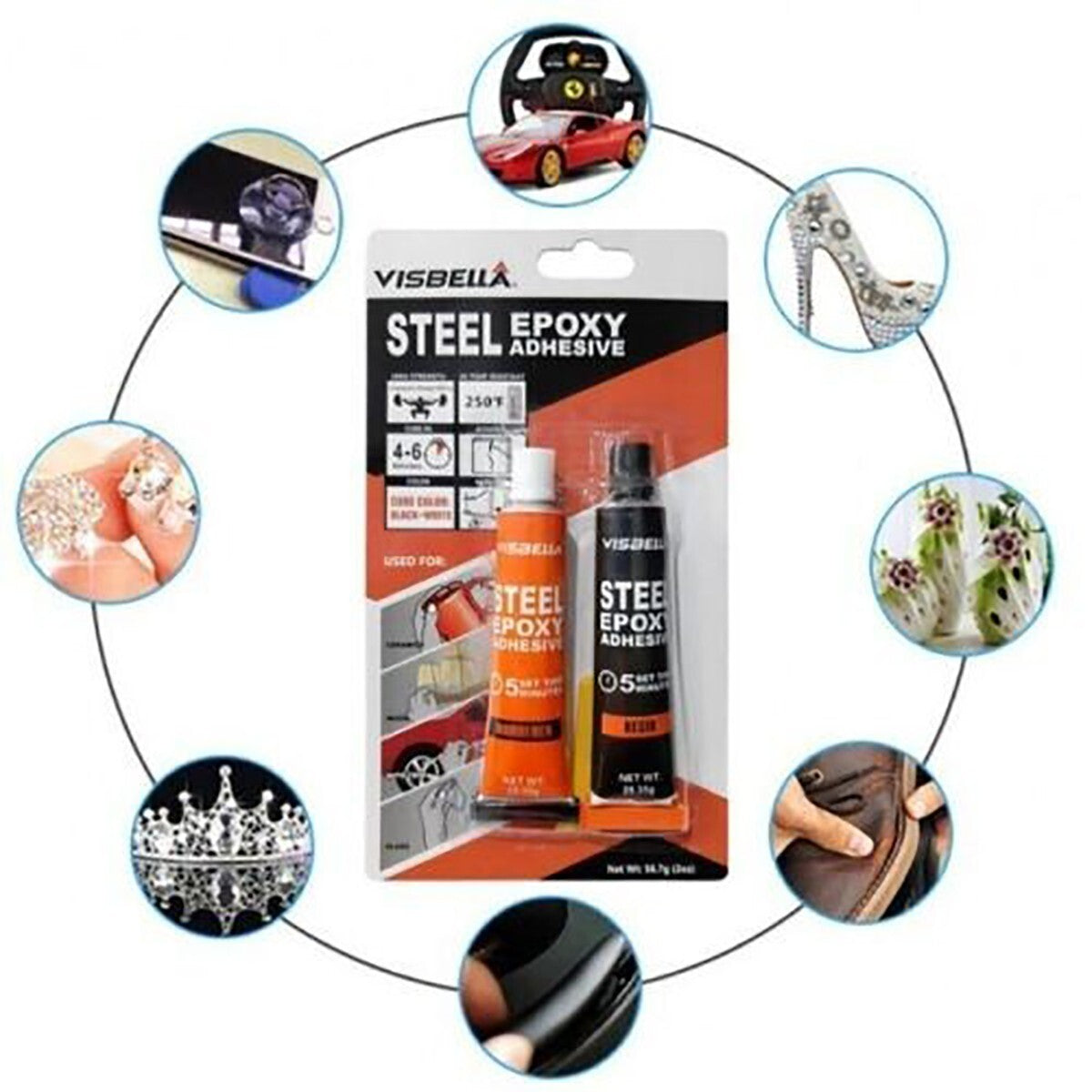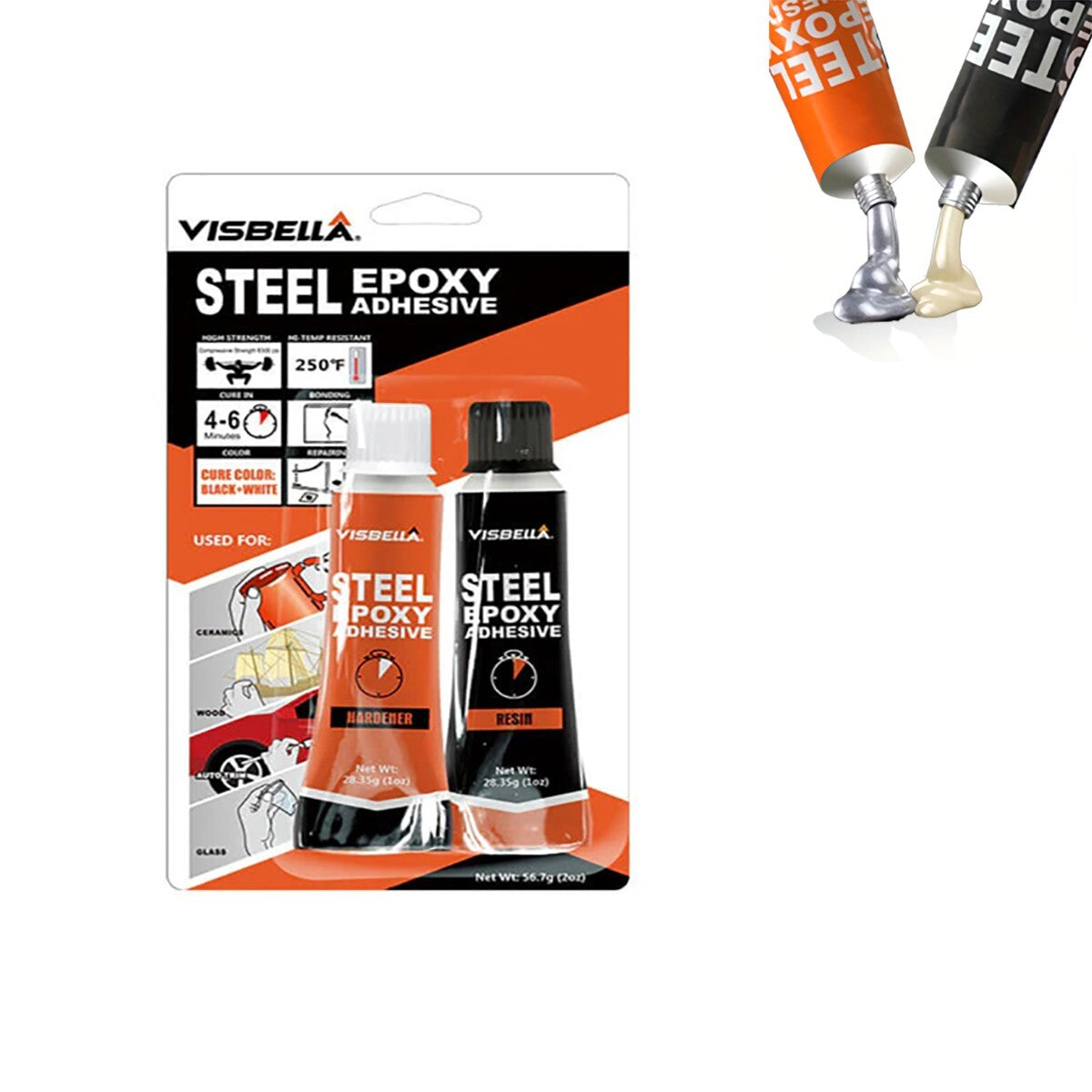 L'adesivo epossidico Visbella in acciaio è un sigillante bicomponente a presa rapida, ideale per riparazioni resistenti su metallo e molte altre superfici. Indurisce in soli 5 minuti e offre una resistenza eccezionale all'acqua, olio, polvere e urti. Può essere forato, levigato e verniciato. Perfetto per lavori fai da te, idraulica, carrozzeria e molto altro. MAGGIORI INFORMAZIONI Caratteristiche principali: Imposta in 5 minuti, polimerizza completamente in 1 ora Forte, duraturo, impermeabile e resistente all'olio Contiene acciaio inossidabile per un legame ultra-resistente Adatto per metallo, vetro, ceramica, legno, plastica, gomma, silicone Non adatto a PP e PE Facile da modellare, riempie crepe, fori e rotture Può essere forato, levigato e verniciato Peso totale: 56,7 g (2 tubi da 28,35 g) La confezione contiene: Nr.1 Tubo di resina epossidica (28,35 g) Nr.1 Tubo di indurente (28,35 g) Nr.1 Strumento di miscelazione/lavoro