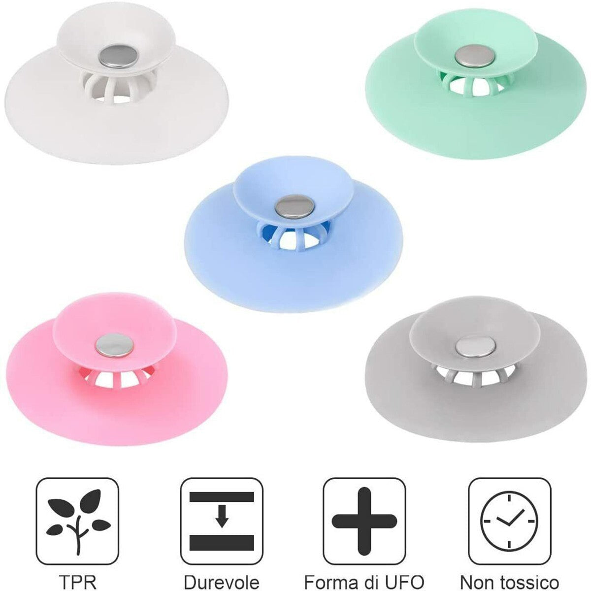 Tappi per vasca da bagno possono filtrare efficacemente rifiuti come capelli e residui alimentari, prevenire l'intasamento del drenaggio ed eliminare gli odori. Tappo bagno universale adotta la forma semplice del disco volante, bella e pratica. Tappo lavandino silicone è utilizzato materiale TPR di alta qualità, materiali spessi, non tossici e non inquinanti, protezione ecologica e ambientale, resistenza alle alte temperature, non facile da indossare. Facile da usare: Rivetto fisso in acciaio inossidabile sulla parte superiore dei tappi vasca da bagno, che può essere sollevato premendo il coperchio del rivetto per un facile accesso e filtraggio. Design dello slot per scheda inferiore, può essere ben bloccato nel foro di scarico. Tappi per lavandini bagno sono adatti per lavandino, cucina, bagno, fognature, ecc. Filtrare i detriti per evitare l'intasamento. Lavare con acqua tiepida o sapone. MAGGIORI INFORMAZIONI Caratteristiche principali: Materiale: TPR Diametro: 10 cm Forma: Forma del disco volante Il colore verrà inviato in base alla disponibilità di magazzino La confezione contiene: Nr.1 Tappo vasca lavandino da bagno universale