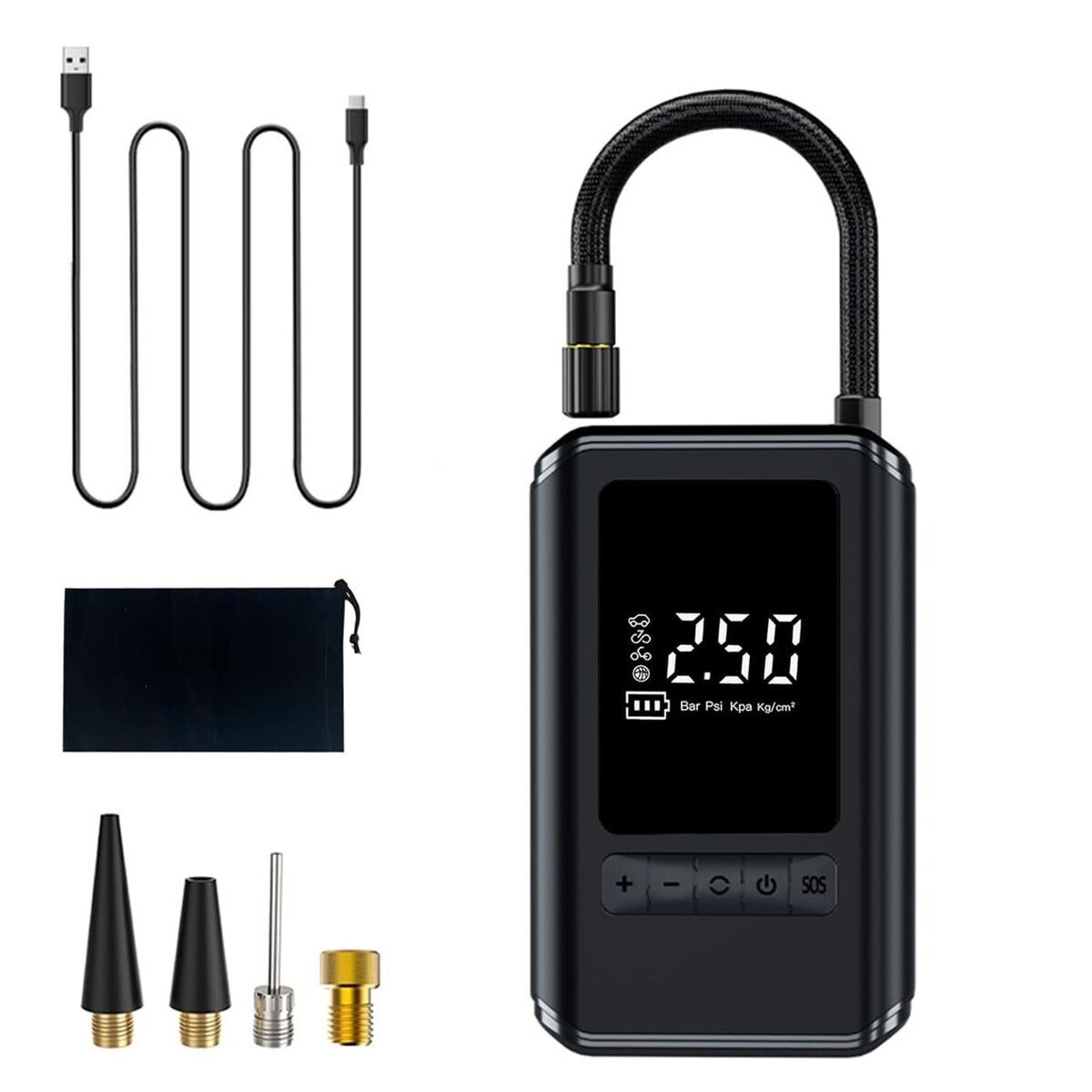 Compressore Auto Multifunzione 2-in-1 Il compressore auto non solo può essere un gonfiatore di pneumatici, ma può anche essere un e una torcia/luce SOS. La luce ha 3 modalità di illuminazione: luce bianca/luce rossa lampeggiante lenta/luce rossa lampeggiante veloce. Non solo può essere utilizzato in macchina, ma è anche comodo portarlo con sé in campeggio o in bicicletta all'aperto. Il compressore è progettato con cilindri ad alta potenza, offrendo prestazioni di gonfiaggio più rapide e costanti per i tuoi pneumatici. Con un tasso di gonfiaggio di 30 L/min, gonfierà uno pneumatico medio per auto di medie dimensioni da 0 a 35 psi in 3-4 minuti. Il design portatile può anche fornire un gonfiaggio efficiente. Questo compressore aria auto è dotato di fori di raffreddamento rettangolari che garantiscono un'eccellente dissipazione del calore. Smetterà automaticamente di funzionare quando la pressione dei pneumatici raggiunge il valore preimpostato. Entrambi i design garantiscono un gonfiaggio stabile e prolungano la durata del prodotto. Le sue dimensioni compatte consentono il funzionamento con una sola mano e occupano uno spazio minimo in auto o in borsa. Con la borsa di stoccaggio in dotazione puoi riporre il tuo mini compressore aria e gli ada