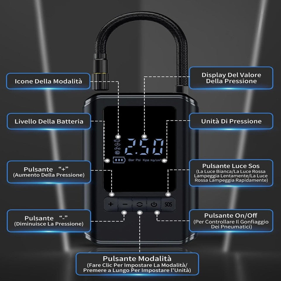 MINI COMPRESSORE AD ARIA AUTO PORTATILE GONFIATORE RICARICABILE DISPLAY LED AUTO