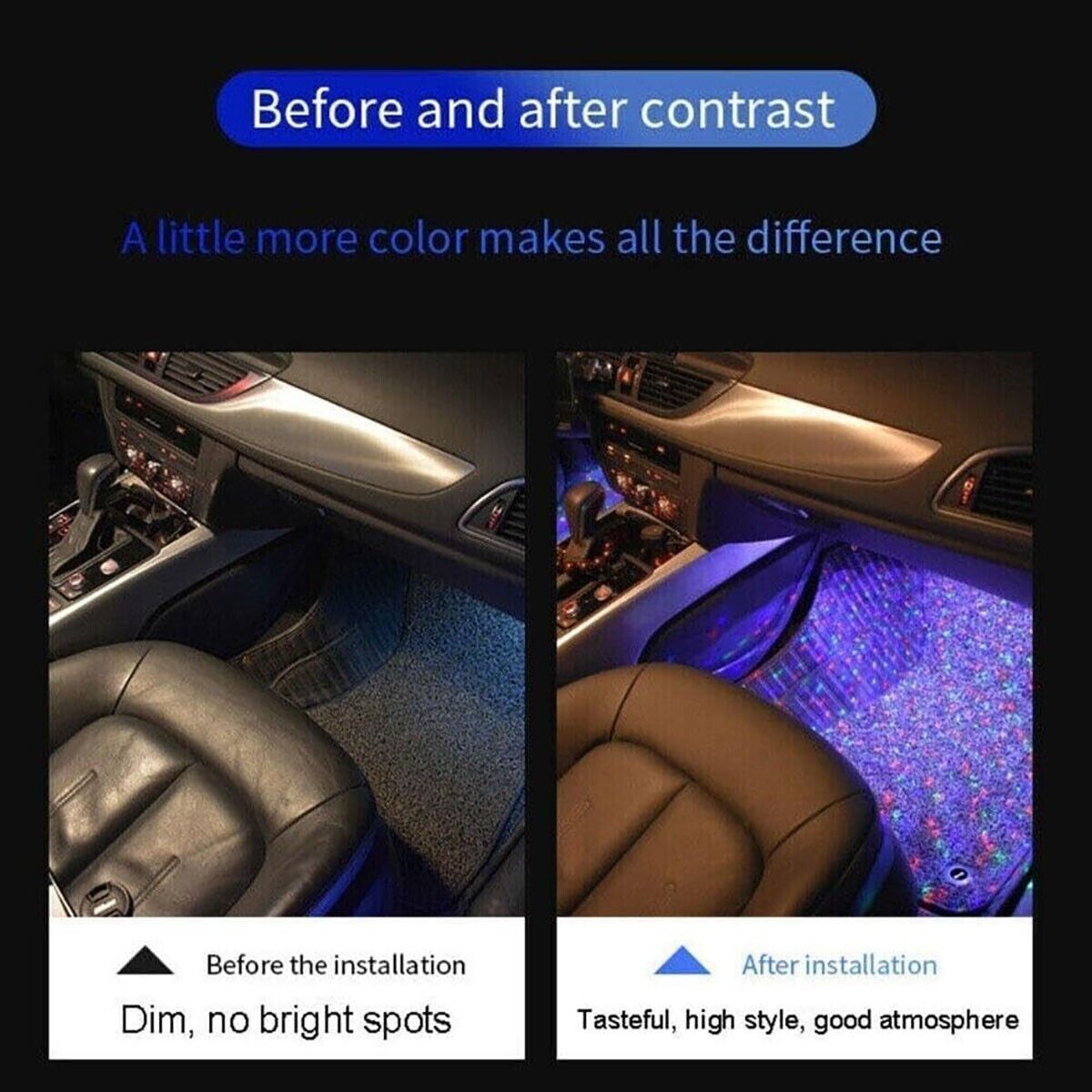 La nostra luce ambientale per interni dell'auto è dotata di funzionalità remote e vocali. Migliora l'interno dell'auto per creare un'atmosfera romantica dall'interno dell'auto. Quando è in modalità audio musicale, i colori cambiano con il ritmo. Le luci a LED possono essere posizionate ovunque nella tua auto, inclusi cruscotto, vano piedi, portabicchieri o anche sotto i sedili. Sono dotati di nastro adesivo che rendono facile fissarli in posizione. Questa versatilità ti consente di illuminare diverse aree della tua auto come desideri. Offre una facile regolazione del colore, della luminosità e delle modalità musicali. È possibile personalizzare la modalità in base alle proprie preferenze. Il design wireless rende l'installazione e la rimozione un gioco da ragazzi, senza preoccupazioni che si aggrovigliano i fili. Sono dotate di un telecomando che consente di regolare colore, luminosità ed effetti di luce in base alle proprie preferenze. Questo ti permette di creare un ambiente personalizzato all'interno della tua auto, sia che tu voglia un'atmosfera rilassante. La presa USB può essere collegata a vari dispositivi come testine di ricarica per cellulari, computer, power bank, accendisigari, ecc. Piccolo e leggero.Materiale: PVC, Tensione di f