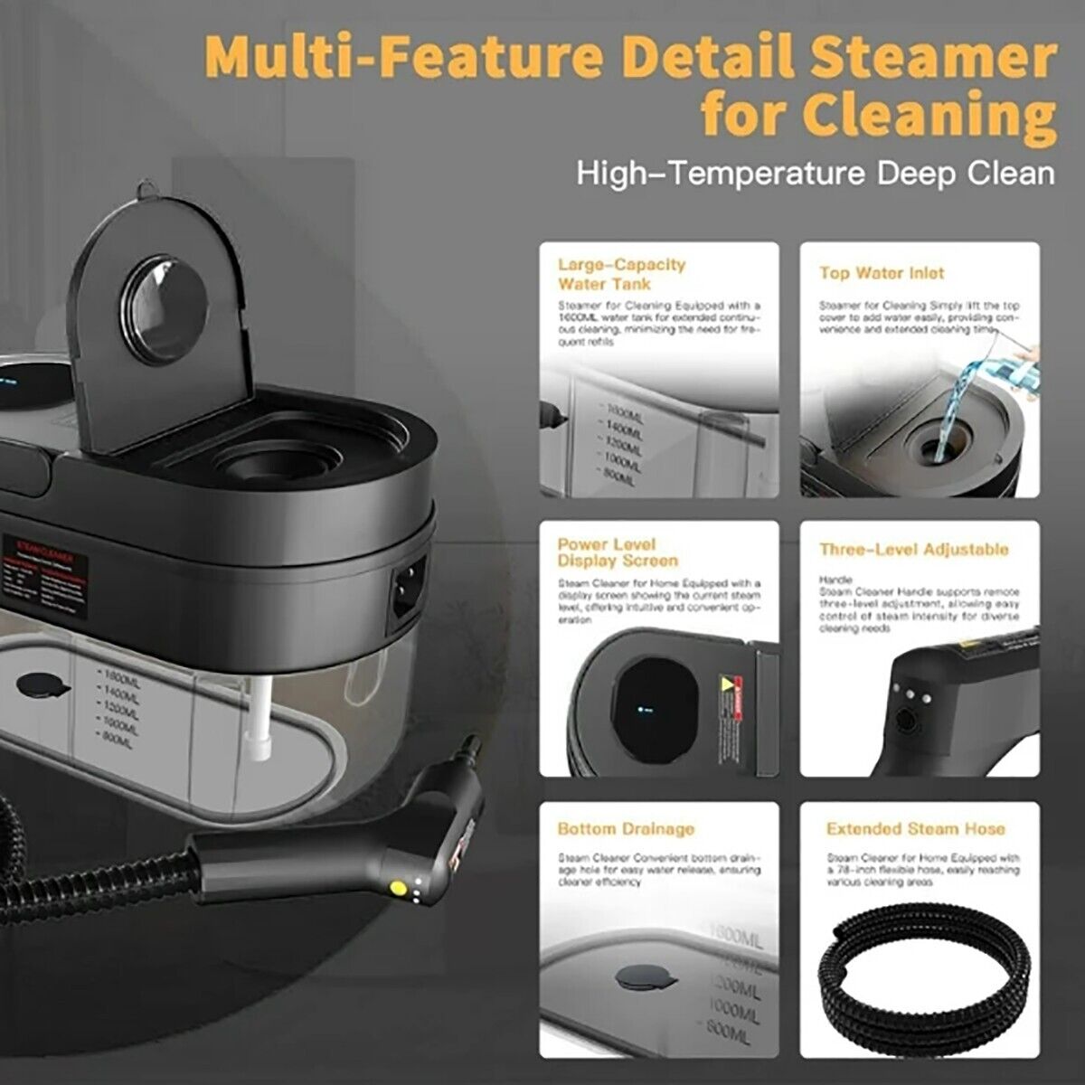 Il nostro pulitore a vapore portatile è la soluzione ideale per una pulizia profonda e senza prodotti chimici. Con 7 accessori inclusi, impugnatura regolabile a 3 livelli e un potente sistema di riscaldamento in soli 15 secondi, questo dispositivo garantisce un'igiene perfetta su ogni superficie. Il serbatoio da 1,60 litri assicura un'autonomia prolungata, rendendolo perfetto per la casa, la cucina, il bagno, i pavimenti, il divano e persino l'auto. MAGGIORI INFORMAZIONI Caratteristiche principali: Capacità serbatoio: 1,60 litri Tempo di riscaldamento: 15 secondi Livelli di regolazione del vapore: 3 Pressione del vapore: 3 bar Materiale: Plastica resistente al calore + componenti in acciaio inox Sicurezza: Sistema di protezione dal surriscaldamento e valvola di sicurezza La confezione contiene: Nr.1 Pulitore a vapore Nr.7 Accessori per la pulizia Nr.1 Manuale utente in inglese
