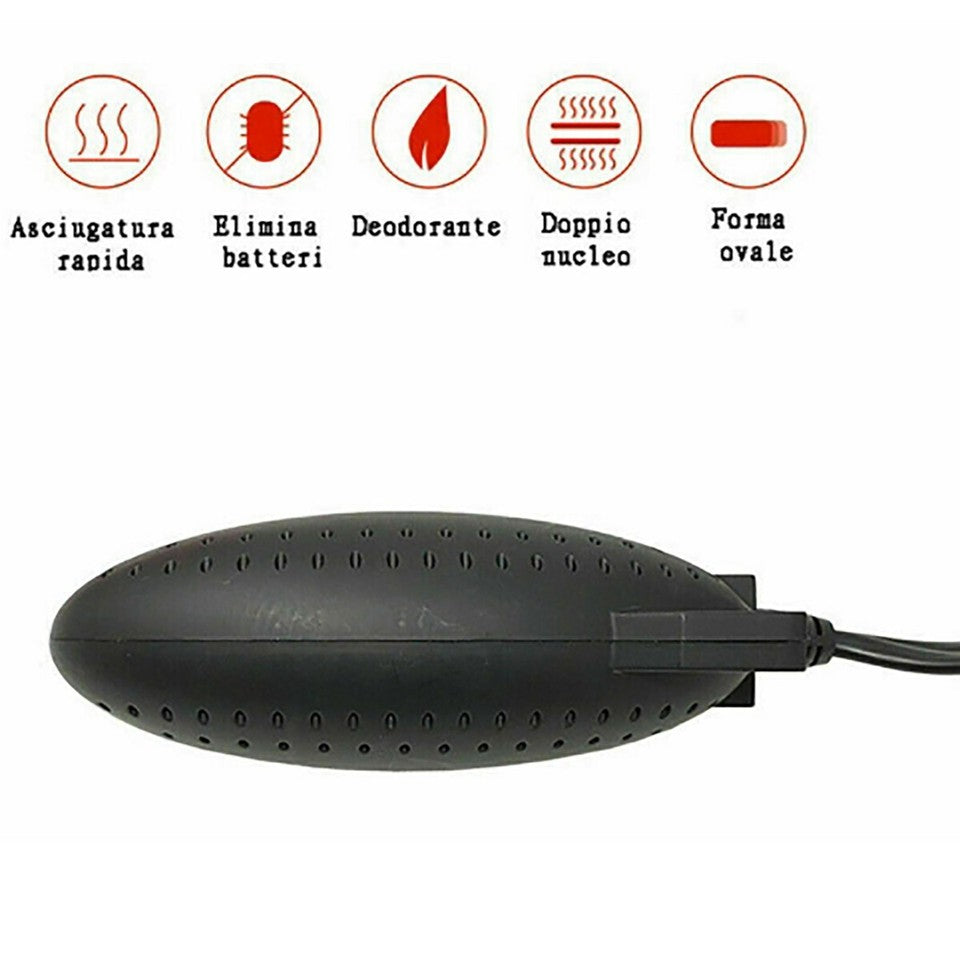 Coppia scalda scarpe scalda asciuga scarpe elettrico sterilizzatore essiccatore Utilissimi essiccatori portatili per scarpe in grado di eliminare umidità dall'interno di tutte le calzature, scarpe, scarponi da sci, doposci, anfibi, scarpe da trekking, ginnastica, stivali di gomma scarpini da calcio o scarpini da sport. Questo sistema permette di eliminare ogni tipo di odore in quanto asciugando l'umidità interna, evita il formarsi di batteri e muffe MAGGIORI INFORMAZIONI Caratteristiche principali: Deumidifica, e disinfetta evitando grazie ad una costante asciugatura la formazioni di batterie. Evita la formazione dei cattivi odori Adatto sia per calzature di gomma che di cuoio. Facile trasportare molto comodo da portare con se in valigia o per gli allenamenti Tensione: 220V/50-60Hz. Potenza: <10W. Dimensioni: 14 x 5.5 x 5 cm La confezione contiene: Nr. 2 Essiccatori per scarpe