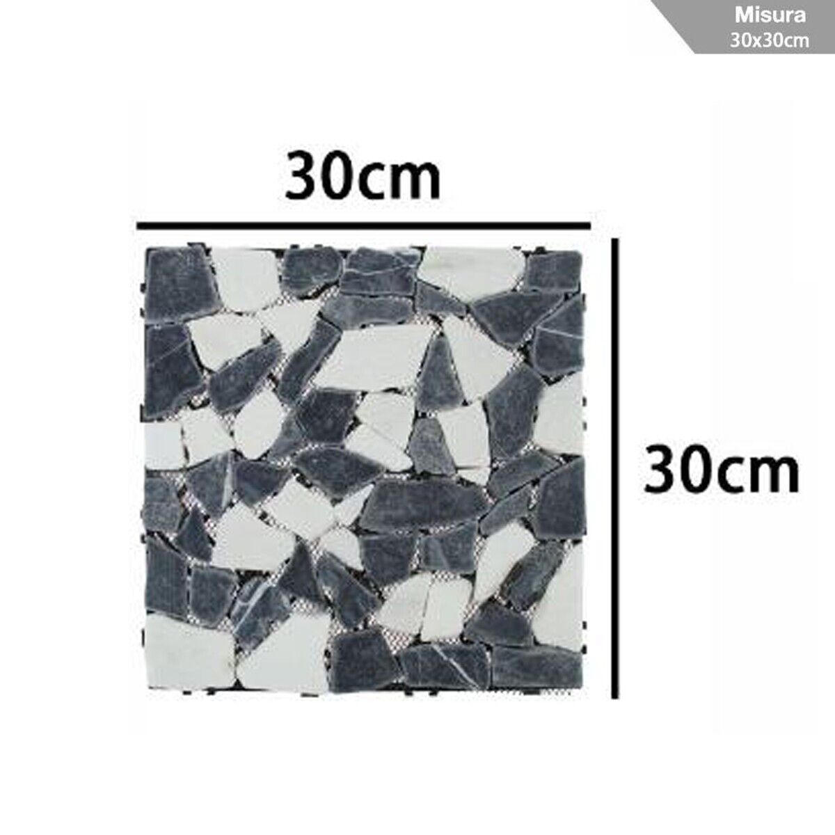 Piastrelle da giardino in marmo con effetto mosaico, ideali per pavimentazioni esterne come terrazzi, balconi, patii e vialetti. Facili da montare grazie al sistema ad incastro fai-da-te, resistenti a tutte le stagioni, antiscivolo e impermeabili. Superficie opaca elegante per un look naturale e tradizionale. MAGGIORI INFORMAZIONI Caratteristiche principali: Materiale: Effetto Marmo Colore: Bianco Nero Dimensioni: 30 x 30 cm per singola piastrella Stile: Tradizionale effetto mosaico Installazione: Sistema ad incastro semplice Superficie: Opaca Specialità: Antiscivolo, resistente all'acqua, adatto a tutte le stagioni Area di utilizzo: Giardino, terrazzo, balcone, patio, pavimentazioni esterne La confezione contiene: Nr.1 piastrella